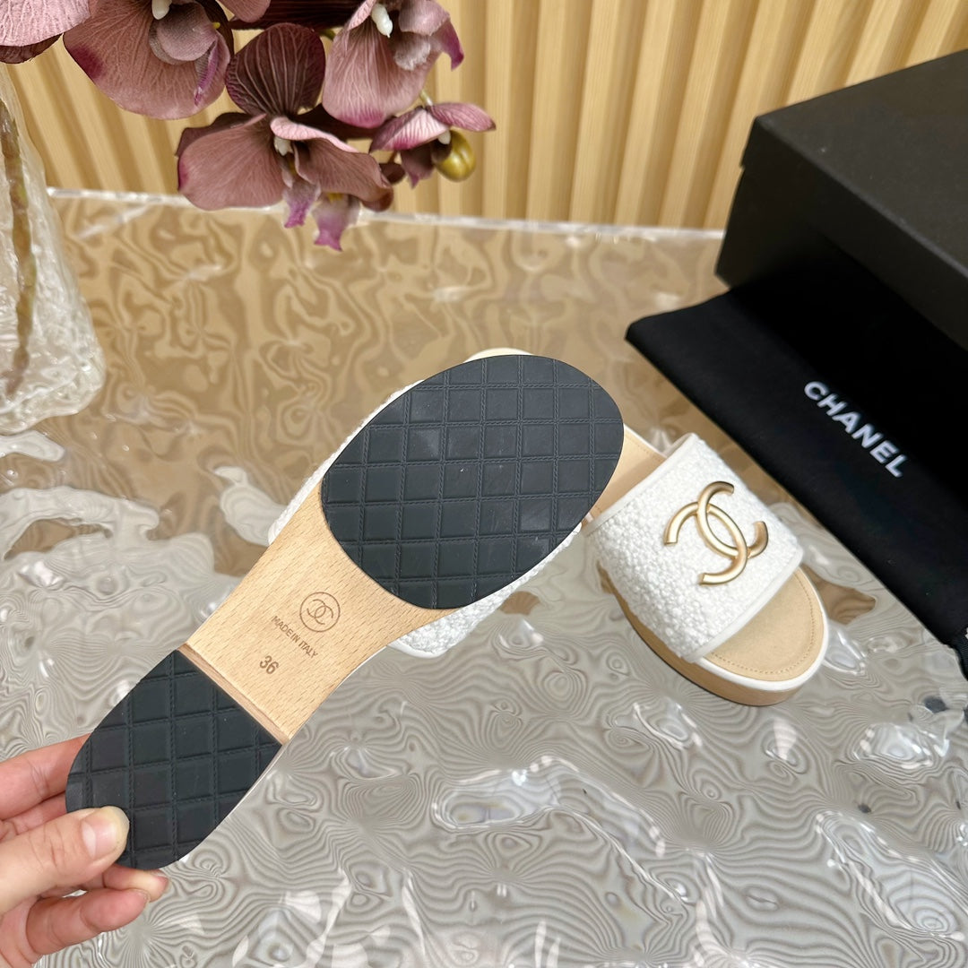 PLATFORM SLIPPERS IN WHITE TWEED AND LAMBSKIN