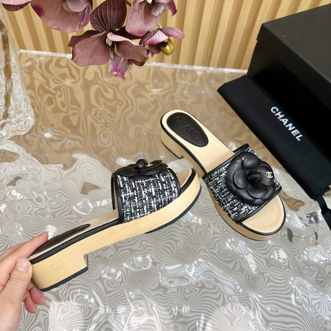 PLATFORM SLIPPERS WITH FLOWER IN BLACK LAMBSKIN