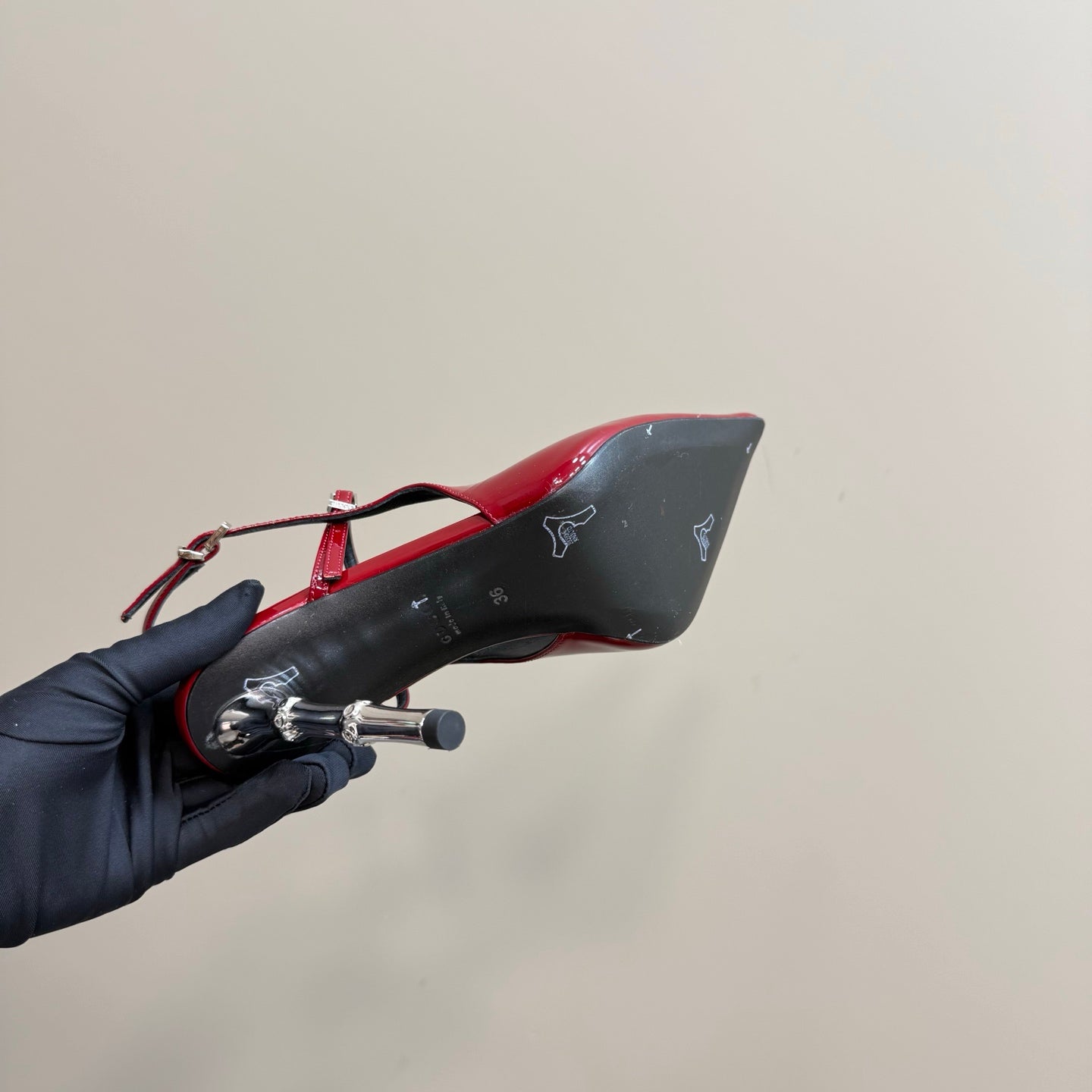 POINTED-TOE HIGH BAMBOO-EFFECT HEEL SLINGBACK IN RED PATENT CALFSKIN