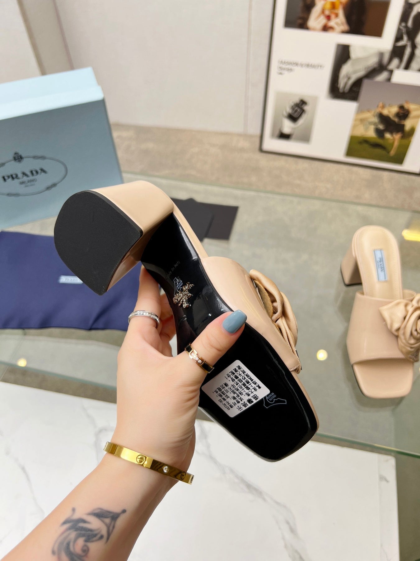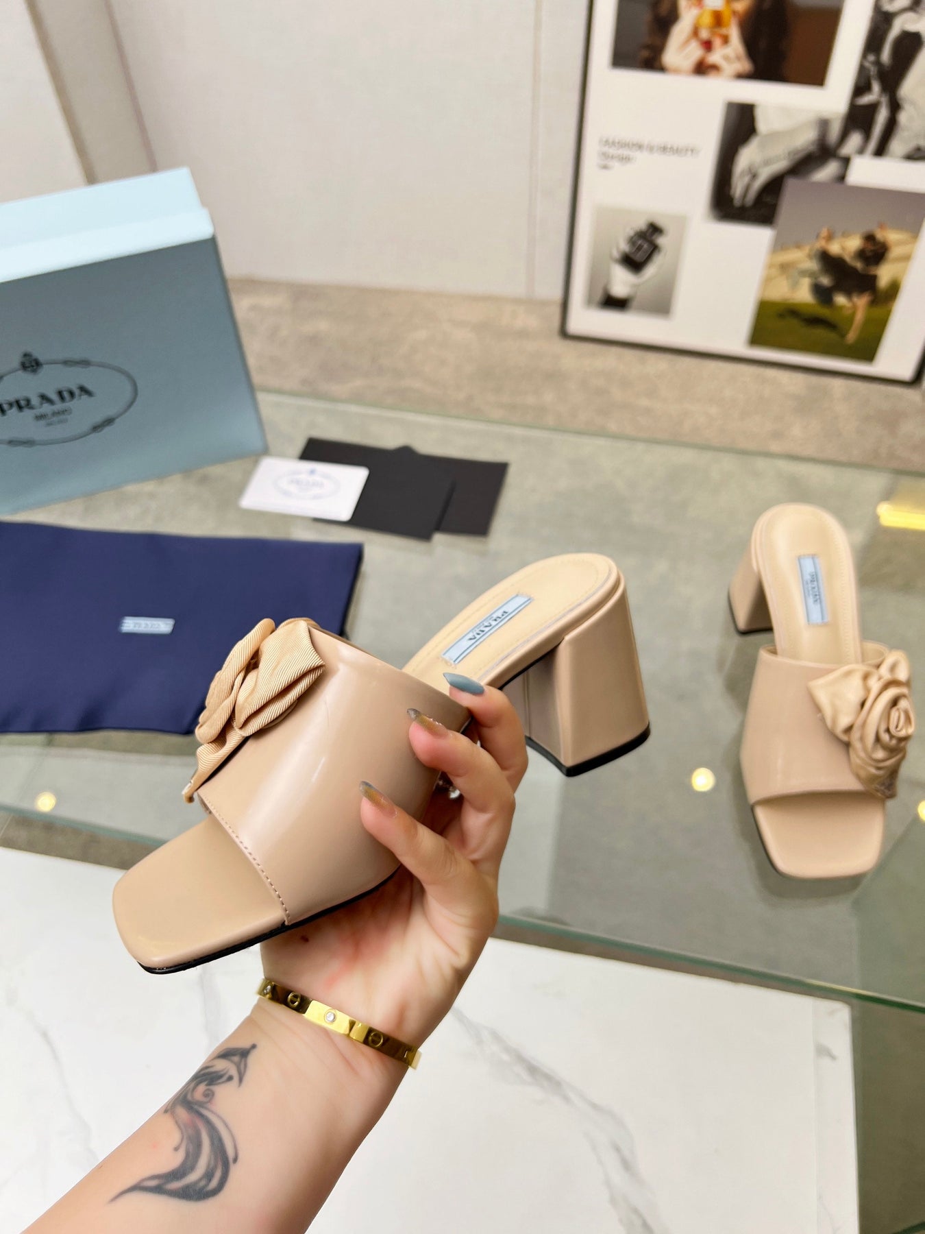PRA FLOWER BLOCK HEELS 75 BEIGE CALFSKIN
