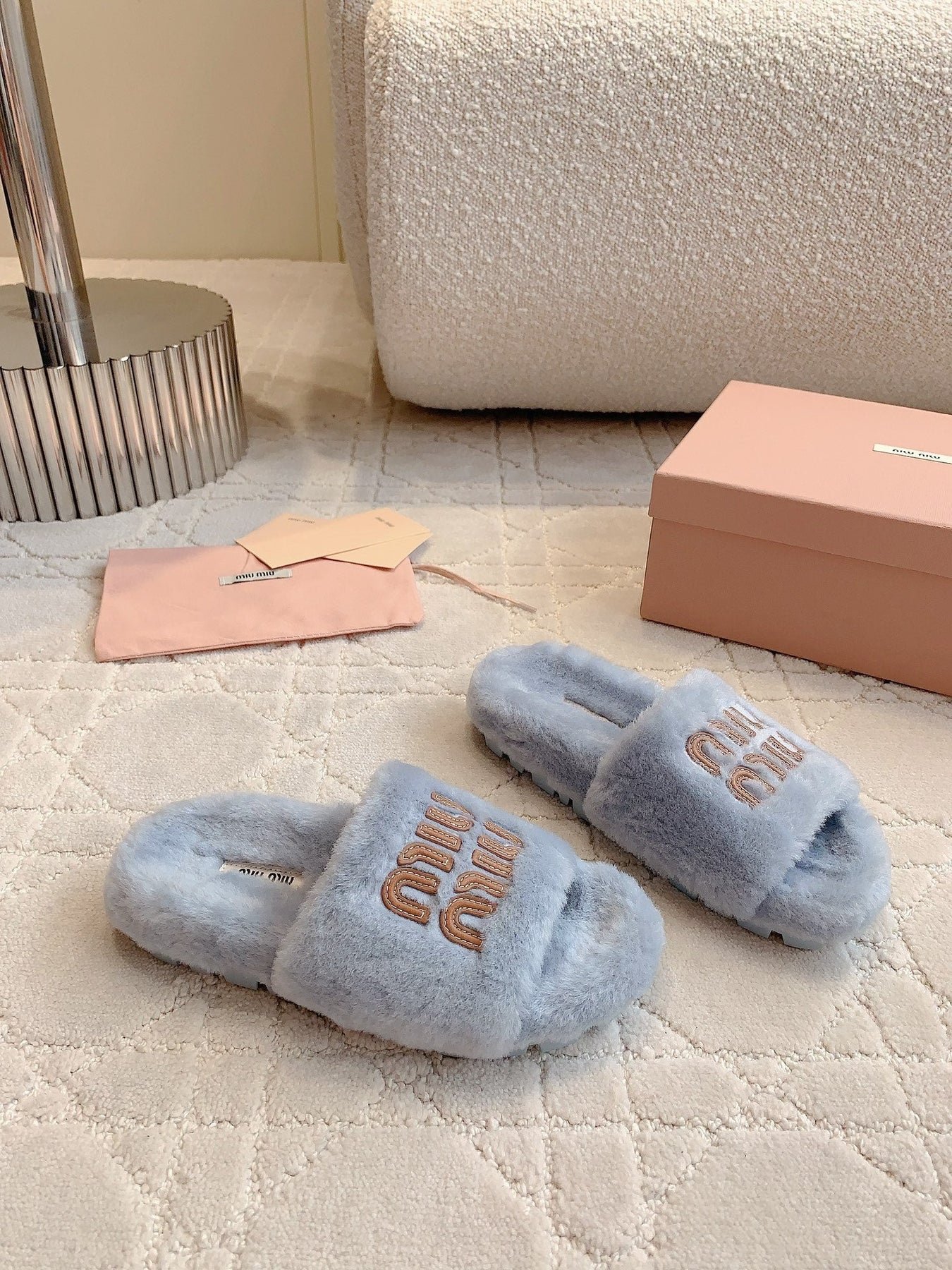 RABBIT FUR SLIPPERS RHINO GRAY WITH EMBROIDED LOGO