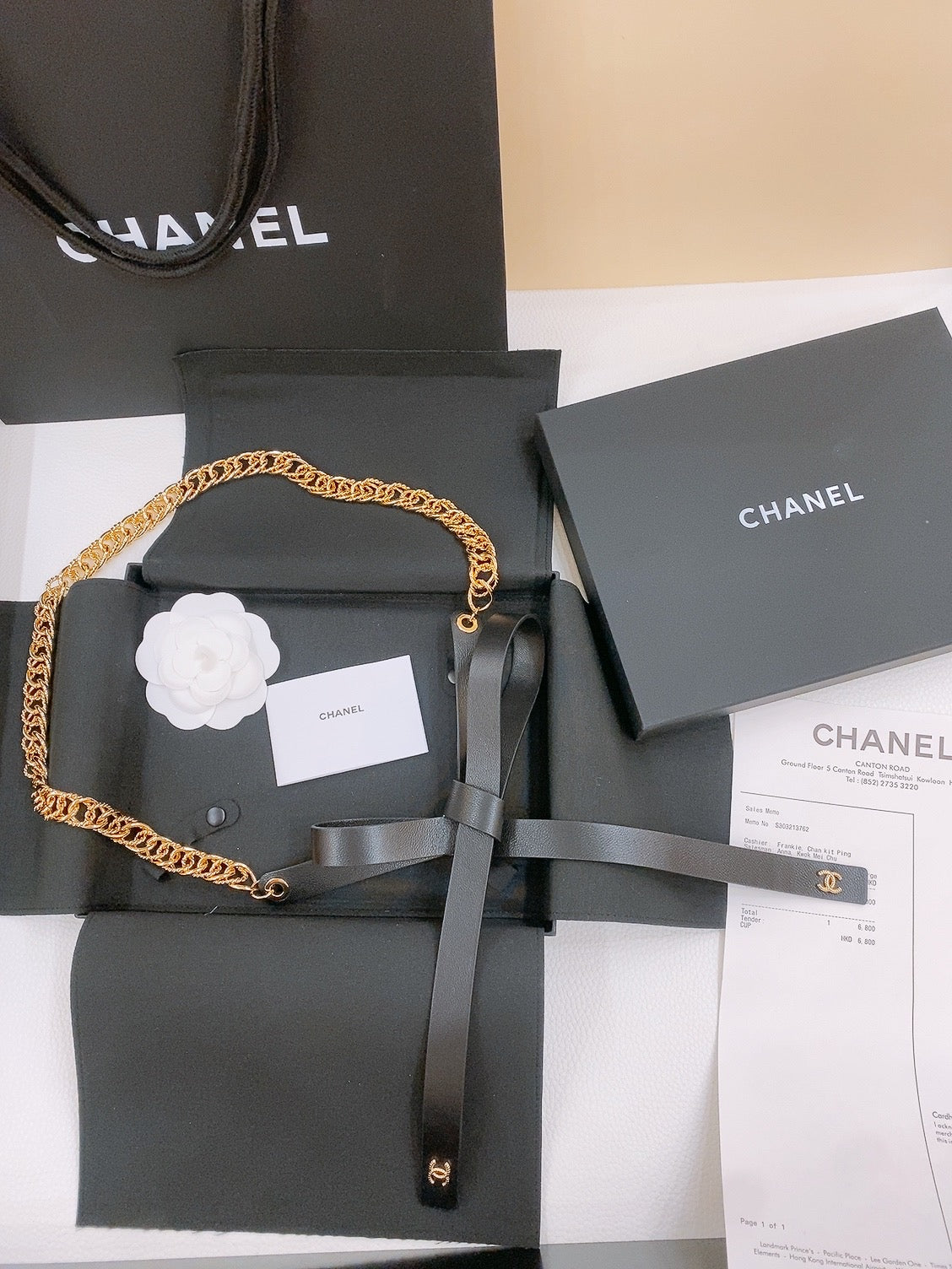 RIBBED BOW WAIST CHAIN IN GOLD TONE BRASS AND BLACK LAMBSKIN