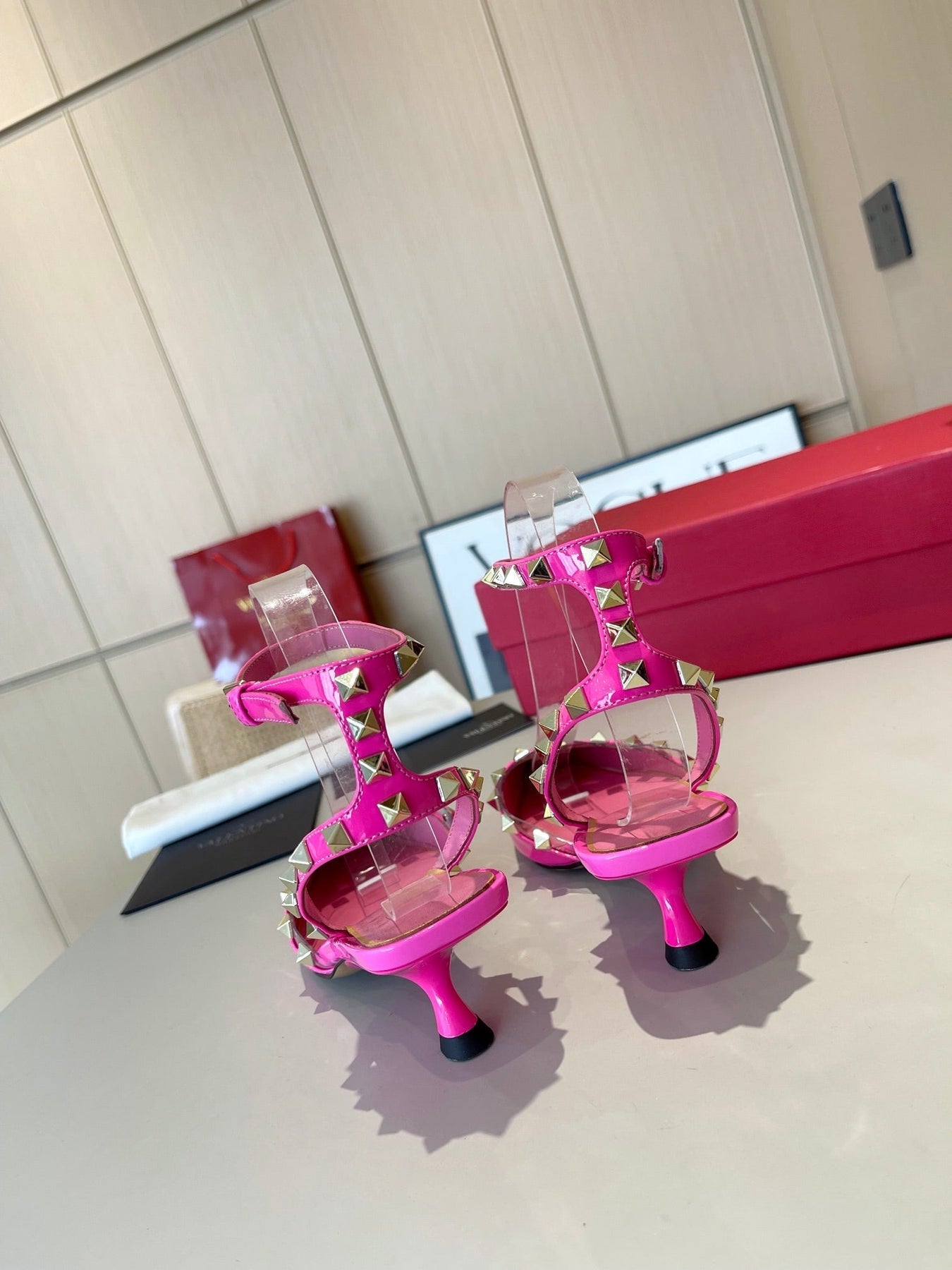 ROCKSTUD CAGED SLINGBACKS 5 CM IN DEEP PINK CALFSKIN