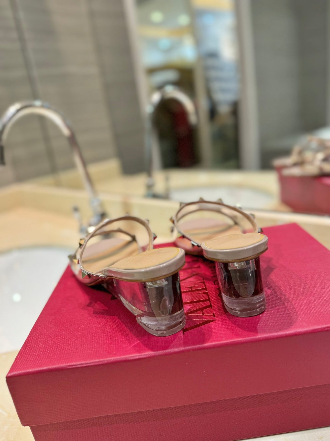 ROCKSTUD MULE SANDALS IN LIGHT PINK CALFSKIN AND TRANSPARENT PVC FILM