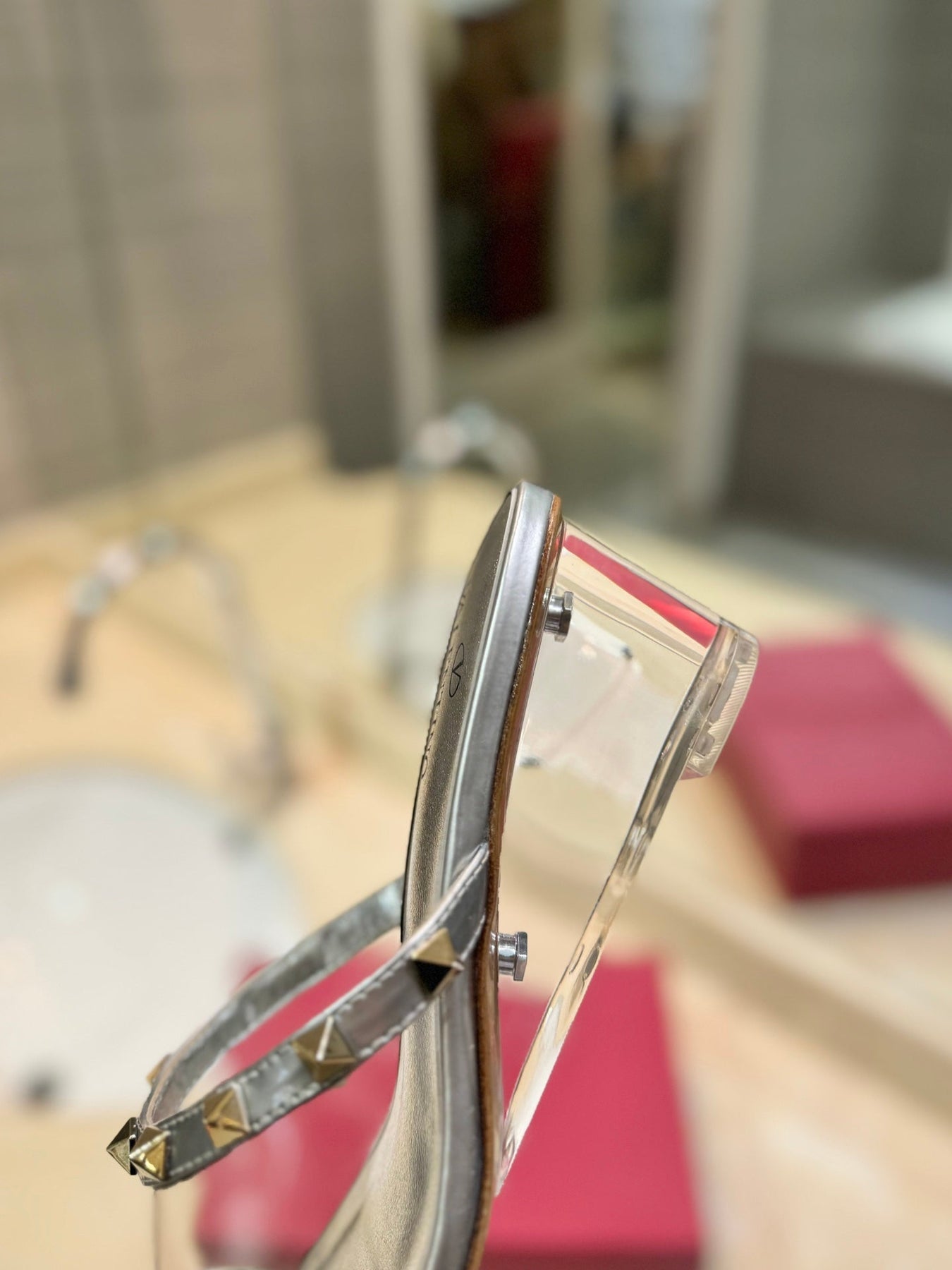 ROCKSTUD MULE SANDALS IN SILVER CALFSKIN AND TRANSPARENT PVC FILM