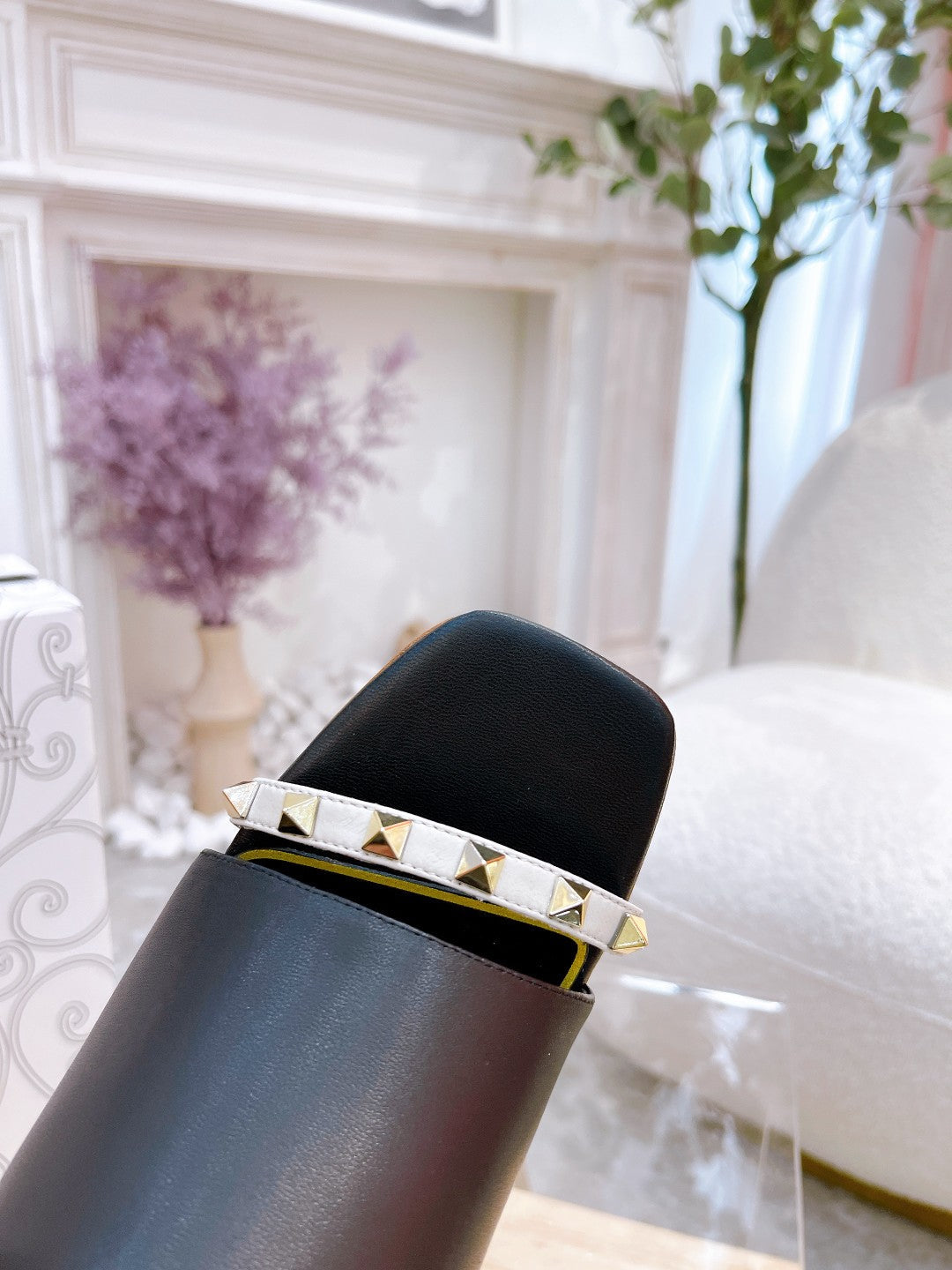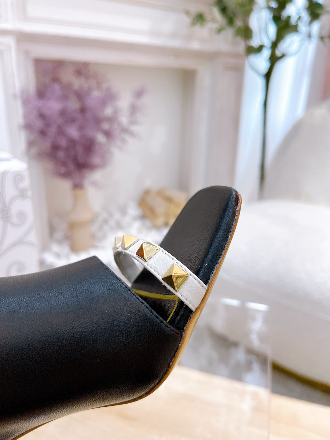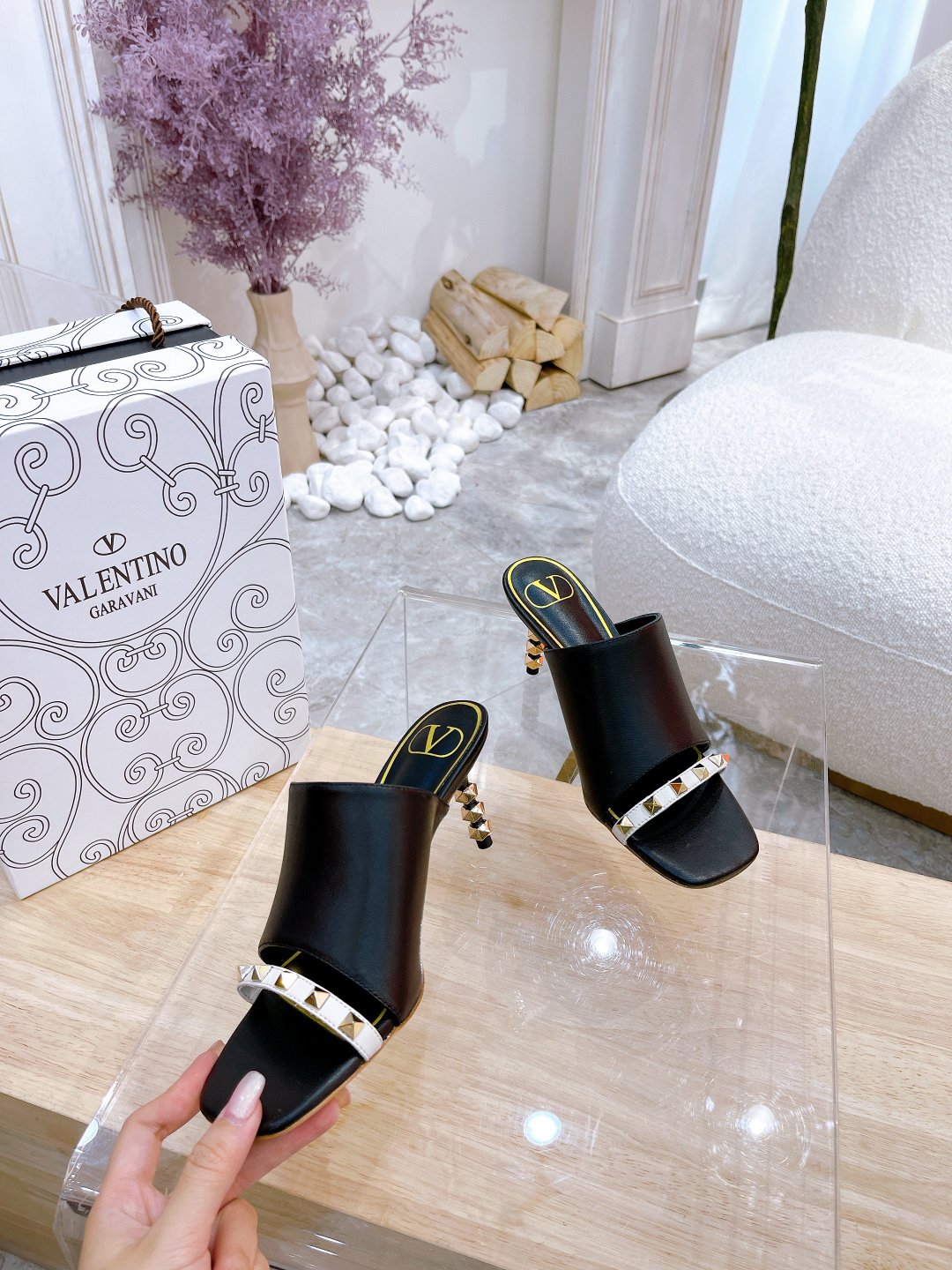 ROCKSTUD TOWER-HEEL MULES IN BLACK CALFSKIN 7 CM